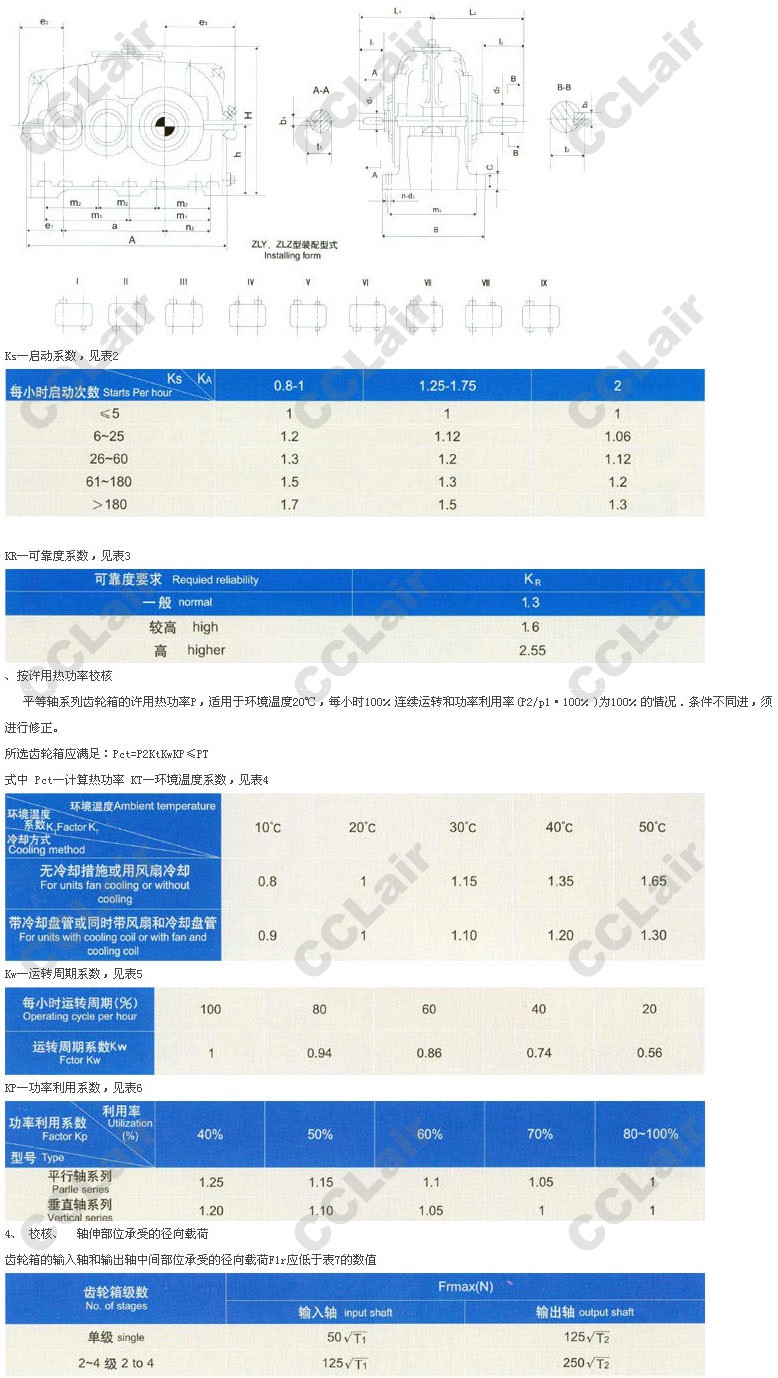 平等軸系列齒輪箱的公稱(chēng)輸入功率PA(表9—20)按載荷平穩(wěn),每天工作時(shí)間小于或等于10h,每小時(shí)啟動(dòng)不超過(guò)5次,允許啟動(dòng)轉(zhuǎn)矩為工作轉(zhuǎn)矩的2倍,單向運(yùn)轉(zhuǎn),單對(duì)齒輪的接觸強(qiáng)度安全系數(shù)約為1,失效率概率小于或等于1%等條件計(jì)算確定的。齒輪箱雙向運(yùn)轉(zhuǎn)時(shí),需視情況將PN乘上0.8—1.0的系數(shù),當(dāng)反向載荷大,換向頻繁、選用的可靠度系數(shù)KR較低時(shí),系數(shù)取較小值,反之取較大值。
