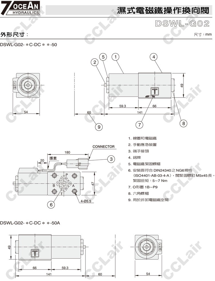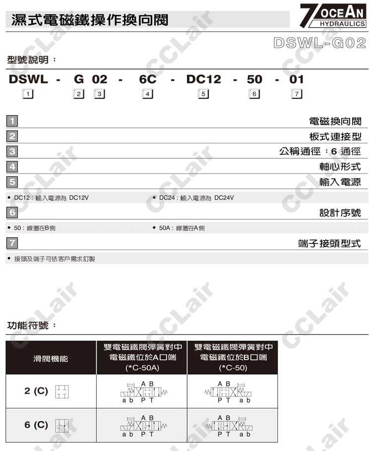 DSWL-G02,DSWL-G02-2C-DC12-50,DSWL-G02-2C-DC12-50A,DSWL-G02-2C-DC24-50,7OCEAN七洋濕式電磁鐵操作換向閥