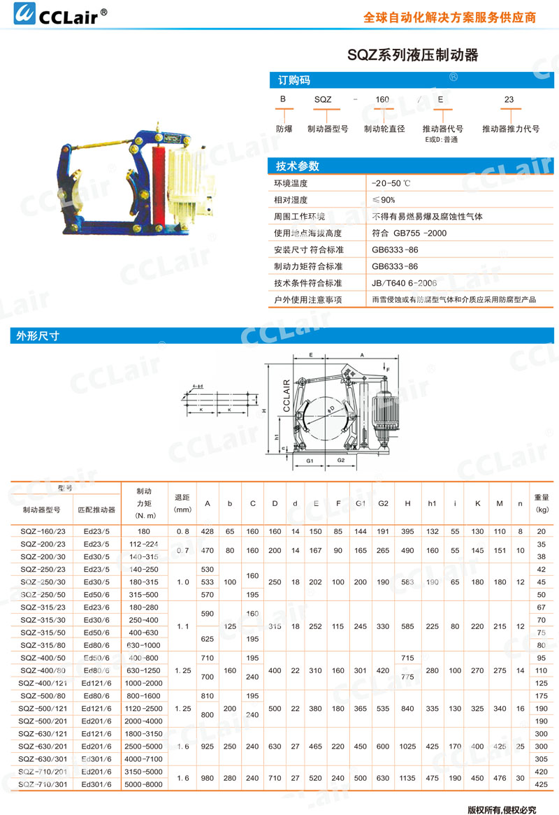 SQZ-160,SQZ-200,SQZ-250,SQZ-315,SQZ-400,BSQZ-315,SQZ-500,SQZ-630,SQZ-710,SQZ-710/301,液壓制動器