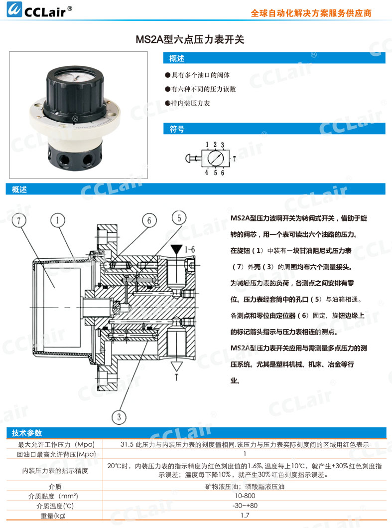 MS2A20/16,MS2A20/25,MS2A20/40,MS2A20/60,MS2A20/100,MS2A20/250,MS2A20/400,六點壓力表開關