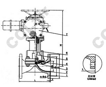 部件列表:1.閥體 2.閥體襯里 3.隔膜 4.閥瓣 5.閥桿 6.閥蓋 7、電動(dòng)頭
