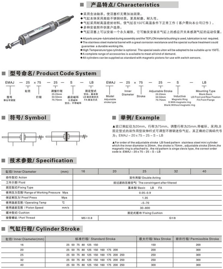 EMAJ-16*25-25,EMAJ-25*50-25,EMAJ-32*75-25,EMAJ-40*80-25,不銹鋼迷你氣缸 |