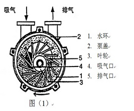 如圖(1)所示2BV水環(huán)真空泵葉輪3偏心地安裝在泵體之內(nèi),起動時向泵內(nèi)注入一定高度的水,因此當葉輪3旋轉(zhuǎn)時,水受離心力的作用而在泵體內(nèi)壁形成一旋轉(zhuǎn)水環(huán)1,水環(huán)下部內(nèi)表面與輪轂相切,沿箭頭方向旋轉(zhuǎn),在前半轉(zhuǎn)過程中,水環(huán)內(nèi)表面逐漸與輪轂脫離,因此在葉輪葉片間功與水環(huán)形成封閉空間,隨著葉輪的旋轉(zhuǎn),該空間逐漸擴大,空間氣體壓力降低,氣體自圓盤吸氣被吸入;在后半轉(zhuǎn)過程中,水環(huán)內(nèi)表面逐漸與輪轂靠近,葉片空間逐漸縮小,空間氣體壓力升高,高于排氣口壓力時,葉片間的氣體自圓盤排氣口被排出。如此葉輪每轉(zhuǎn)動一周,葉片間的空間吸排氣一次,許多空間不停地工作,2BV水環(huán)式真空泵就連續(xù)不斷地抽吸或壓送氣體。