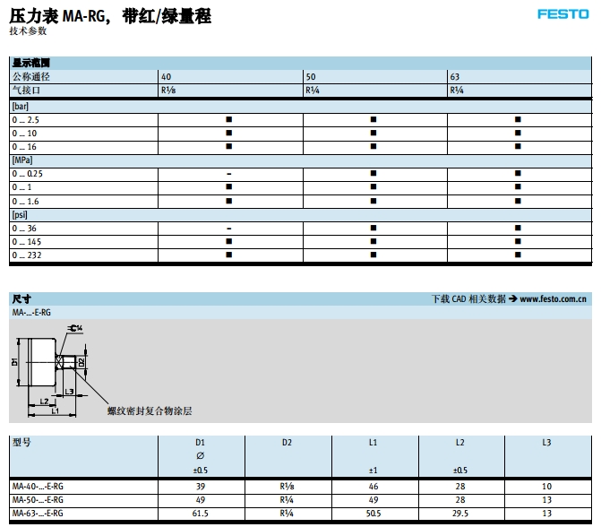 MA-40-2.5-R1/8,MA-50-10-R1/4,MA-63-16-R1/4-MPA-E-RG,festo壓力表 |