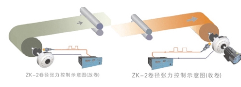 本系統(tǒng)對(duì)收卷滾筒或送料輥筒提供恒定張力控制。收卷滾筒或送料滾筒的物料需要恒定張力,本裝置利用滾筒直徑的連續(xù)變化,逐步線性地減少(或增加)磁粉制動(dòng)器(或磁粉離合器)的勵(lì)磁電流,從而改變對(duì)滾筒的制動(dòng)(或離合)的力矩。在轉(zhuǎn)動(dòng)的滾筒軸旁安裝接近傳感器來檢測(cè)滾筒直徑的變化,將檢測(cè)到的滾筒直徑變化反饋給體儀表,使其輸出一個(gè)與之相應(yīng)的控制電流。本儀表有開始半徑及終止半徑設(shè)定,當(dāng)滾筒到達(dá)終止直徑時(shí)儀表自動(dòng)蜂鳴報(bào)警。