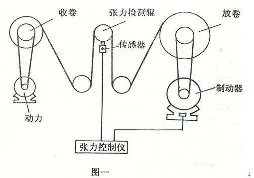 本系統(tǒng)構(gòu)成如圖一物料的張力通過張力檢測輥,作用在荷重傳感器上,張力控制儀通過荷重傳感器檢測實時張力,并與設(shè)定張力進行比較、運算,產(chǎn)生控制信號,驅(qū)動變頻器電機執(zhí)行對張力的控制。