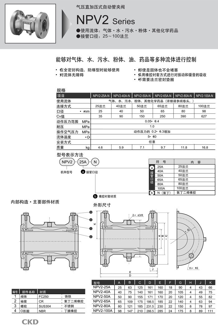 NPV2-25A-N,NPV2-40A-N,NPV2-50A-N,NPV2-65A-N,NPV2-80A-N,NPV2-100A-N,CKD直壓式自動(dòng)管夾閥