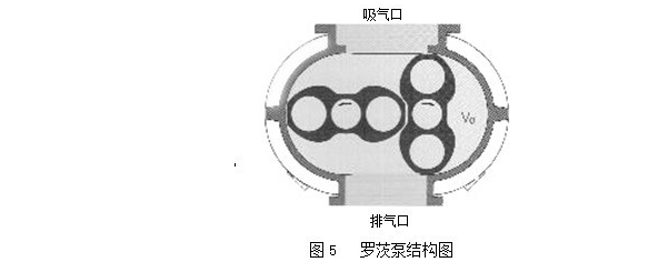 羅茨泵的結(jié)構(gòu)見(jiàn)圖5。在泵腔內(nèi),有一對(duì)8字形的轉(zhuǎn)子相互垂直地安裝在一對(duì)平行軸上,由傳動(dòng)比為1的一對(duì)齒輪帶動(dòng)作彼此反向的同步旋轉(zhuǎn)運(yùn)動(dòng)。在轉(zhuǎn)子之間,轉(zhuǎn)子與泵殼內(nèi)壁之間,保持有一定的間隙,可以實(shí)現(xiàn)高轉(zhuǎn)速運(yùn)行。由于羅茨泵是一種無(wú)內(nèi)壓縮的真空泵,通常壓縮比很低,故需要前級(jí)泵。羅茨泵的極限真空除取決于泵本身結(jié)構(gòu)和制造精度外,還取決于前級(jí)泵的極限真空。為了提高泵的極限真空度,可將羅茨泵串聯(lián)使用羅茨泵的工作原理與羅茨鼓風(fēng)機(jī)相似。由于轉(zhuǎn)子的不斷旋轉(zhuǎn),被抽氣體從吸氣口吸入到轉(zhuǎn)子與泵殼之間的空間VO內(nèi),再經(jīng)排氣口排出。由于吸氣后VO空間是全封閉狀態(tài),所以,在泵腔內(nèi)氣體沒(méi)有壓縮和膨脹。