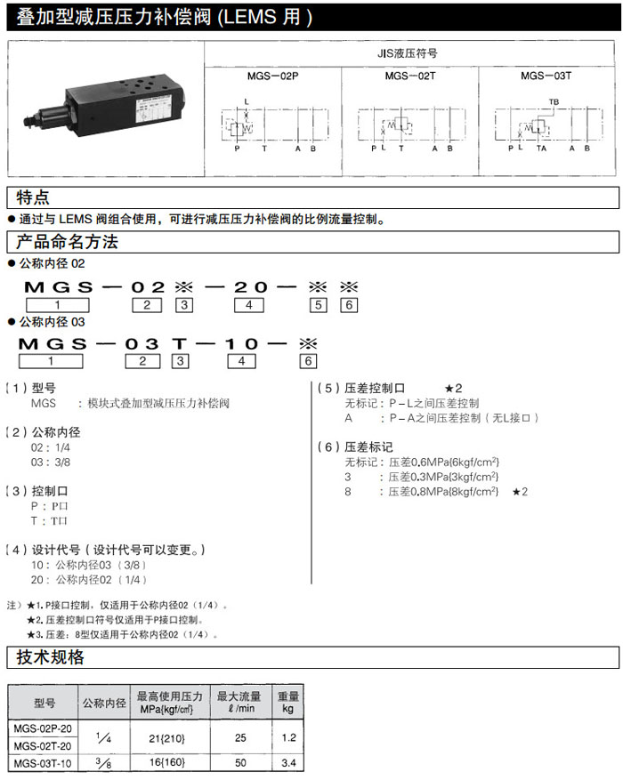 MGS-02P-20,MGS-03T-10,MGS-02T-20,MGS-03P-20,MGS-03T-20,DAIKIN疊加型減壓壓力補(bǔ)償閥
