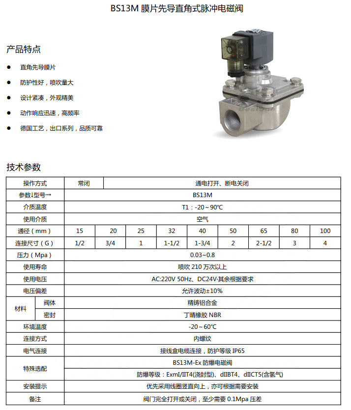 BS13M-DN15,BS13M-DN20,BS13M-DN25,BS13M-DN32,膜片先導(dǎo)直角式脈沖電磁閥