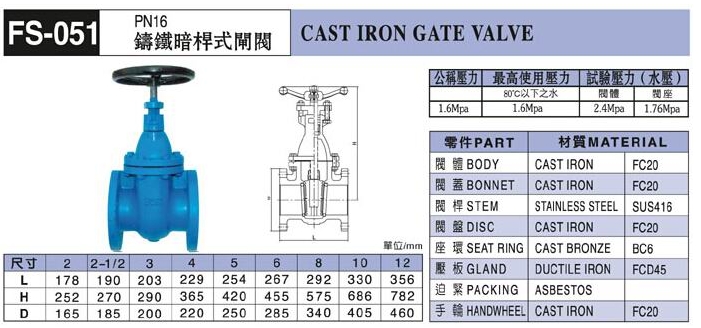 鑄鐵暗桿式閘閥,閥桿螺母設在閘板上,手輪轉動帶動閥桿轉動,而使閘板提升,通常在閥桿的底端有梯形螺紋,通過閥門底端的螺紋以及閥瓣上的導槽,將旋轉運動變?yōu)橹本€運動,也就是將操作轉矩變?yōu)椴僮魍屏Αi_啟閥門時,當閘板提升高度等于閥門通徑的1:1倍時,流體的通道完全暢通,但在運行時,此位置是無法監(jiān)視的。實際使用時,是以閥桿的頂點作為標志,即開不動的位置,作為它的全開位置。為考慮溫度變化出現(xiàn)鎖死現(xiàn)象,通常在開到頂點位置上,再倒回 1/2-1圈,作為全開閥門的位置。因此,閥門的全開位置,按閘板的位置(即行程〉來確定。