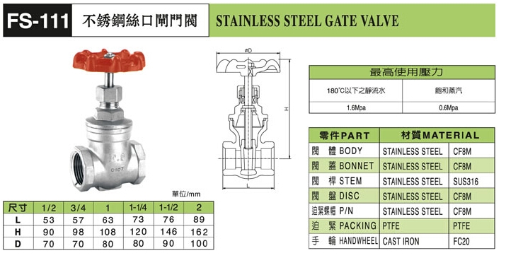 FS-111不銹鋼絲口閘閥硅溶膠鑄造閥體,工藝美觀,標準304材質,無銹斑,美國保險業(yè)UL認證。富山絲扣閘閥的啟閉件是塞形的閥瓣,密封面呈平面或錐面,閥瓣沿流體的中心線作直線運動。閥桿的運動形式,有升降桿式(閥桿升降,手輪不升降),也有升降旋轉桿式(手輪與閥桿一起旋轉升降,螺母設在閥體上)。紋管截止閥只適用于全開和全關,不允許作調節(jié)和節(jié)流。