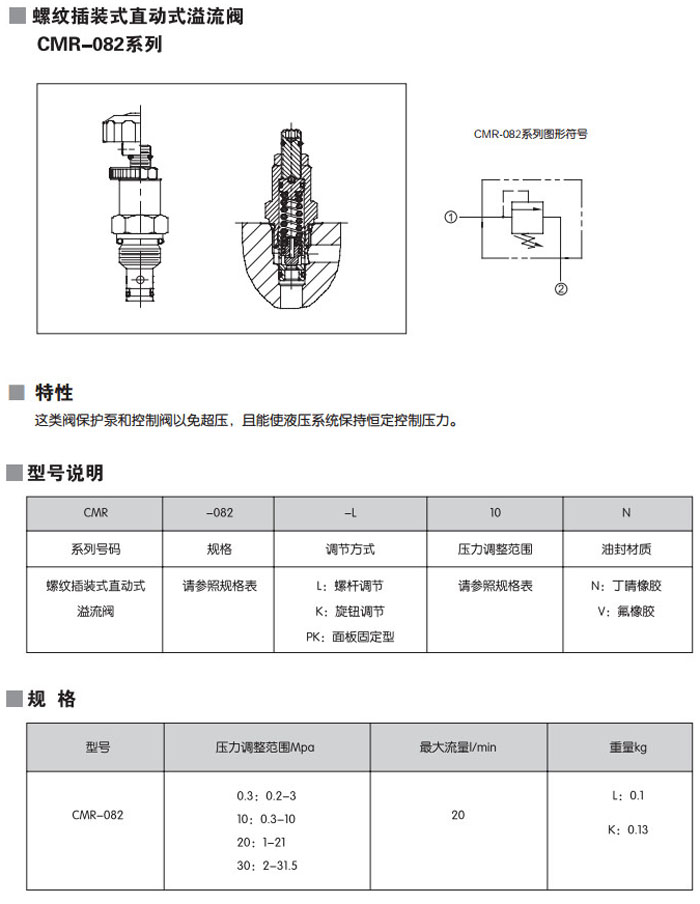 CMR-082-L0.3N,CMR-082-K0.3N,CMR-082-PK0.3N,CMR-082-L10N,CMR-082-L20N,CMR-082-L30N,螺紋插裝式直動(dòng)式溢流閥