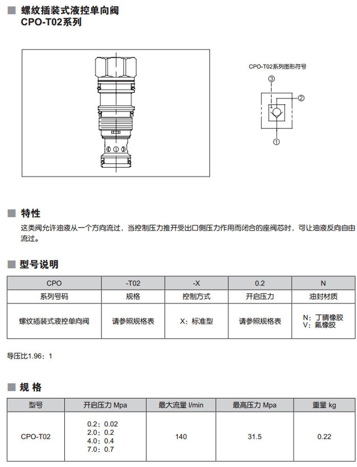 CPO-T02-X0.2N,CPO-T02-X2.0N,CPO-T02-X4.0N,CPO-T02-X7.0N,CPO-T02-X0.2V,螺紋插裝式液控單向閥