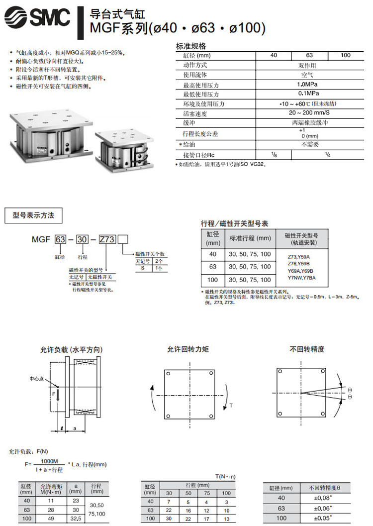MGF40-30,MGF63-30,MGF100-30,MGF40-50,MGF63-50,MGF100-50,SMC導臺式氣缸