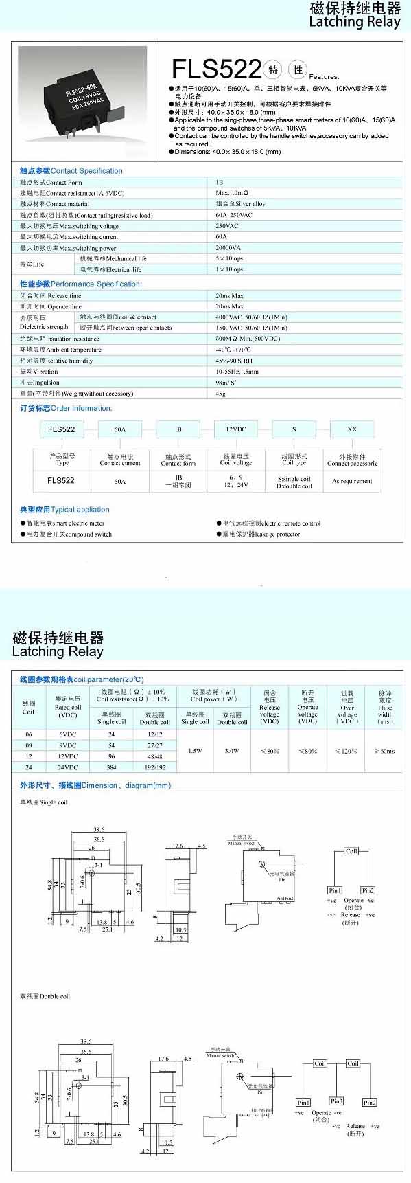FLS522-60A,磁保持繼電器
