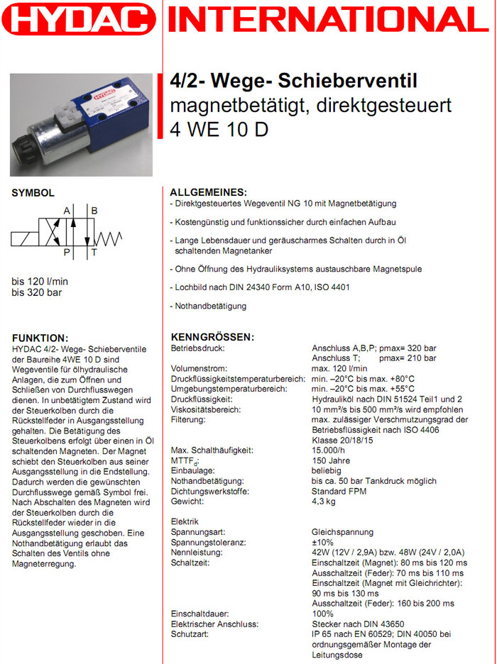 4WE10DS01-12DG/V,4WE10DS01-24DG/V,HYDAC電磁4/2方向滑閥